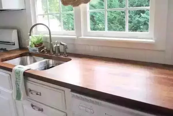 喜欢逛宜家的肯定知道,很多橱柜都用了木质台面,颜值确实很高,让厨房看起来很温馨,尤其是做开放式厨房,更加出彩,但大叔也要泼冷水了,厨房作为一个家庭使用率最高的地方,木材终究是怕水,虽然前期可用漆面或者更好的工艺保护,但时间一久,强度、耐水、耐碱等问题都会出现,所以,如果你家使用率不太高,可用考虑。