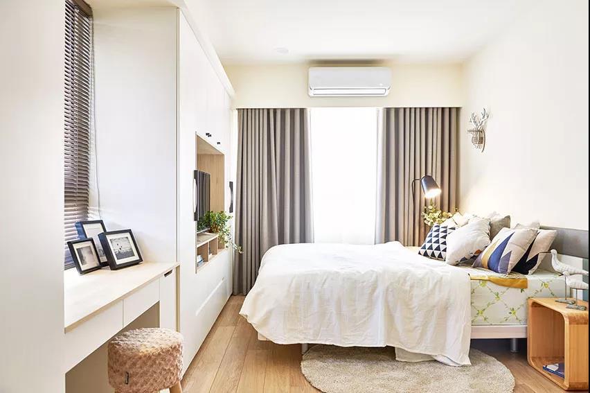家里无处不在的白色系统柜,再多的东西也不怕没地方放。除了落地窗帘和各种设计饱满的小家具,卧室的整体搭配几乎是照搬客厅的风格。方形外观与光滑曲线的床头柜机能良好,小柠特想带一个走~